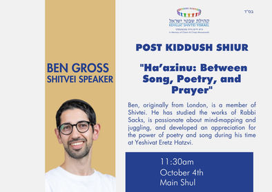 09:00 Shacharit Main Minyan (in Shul) followed by Kiddush (in Front Sukkah) and Post Kiddush Shiurwith Ben Gross on "Ha’azinu: Between Song, Poetry, and Prayer"